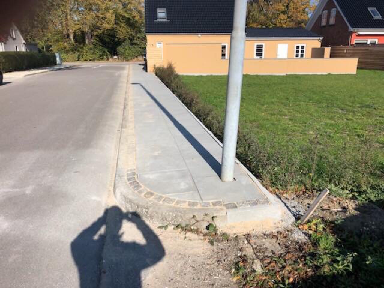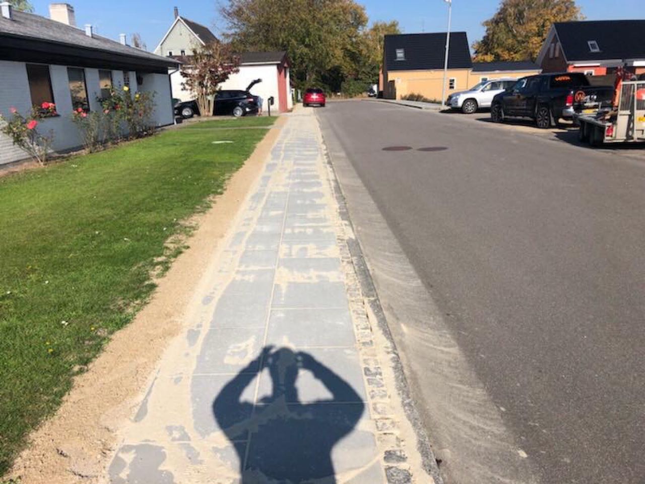 Arbejdet er udført for Lollands Kommune. Der er udført fortovsrenovering, hvor vi har gravet det gamle fortov op og og sat nye kansten, samt lagt nye fortovsfliser i 2 skifte og sat chaussésten i bort ud til kantsten.