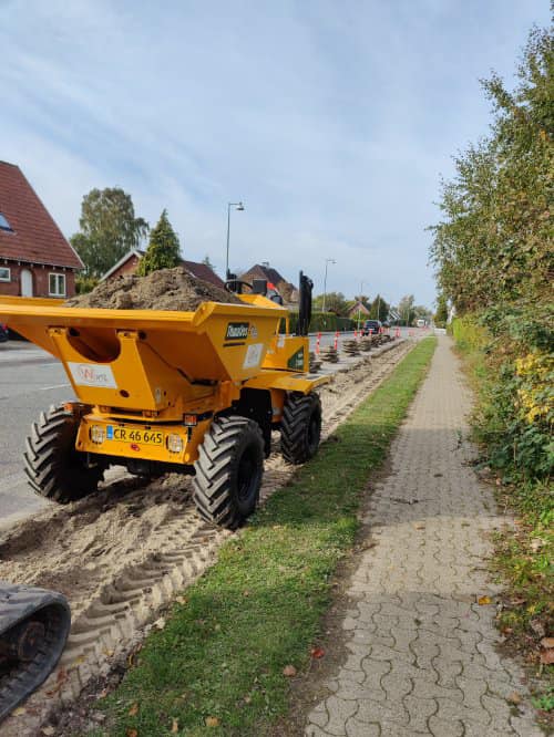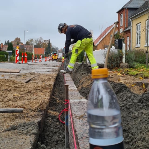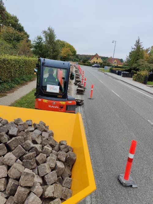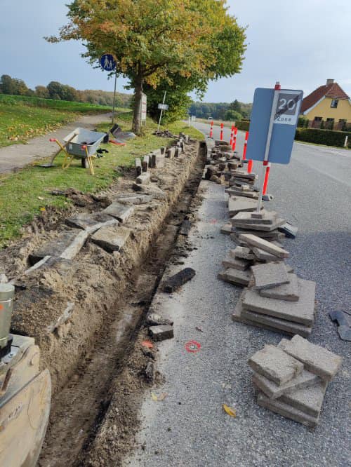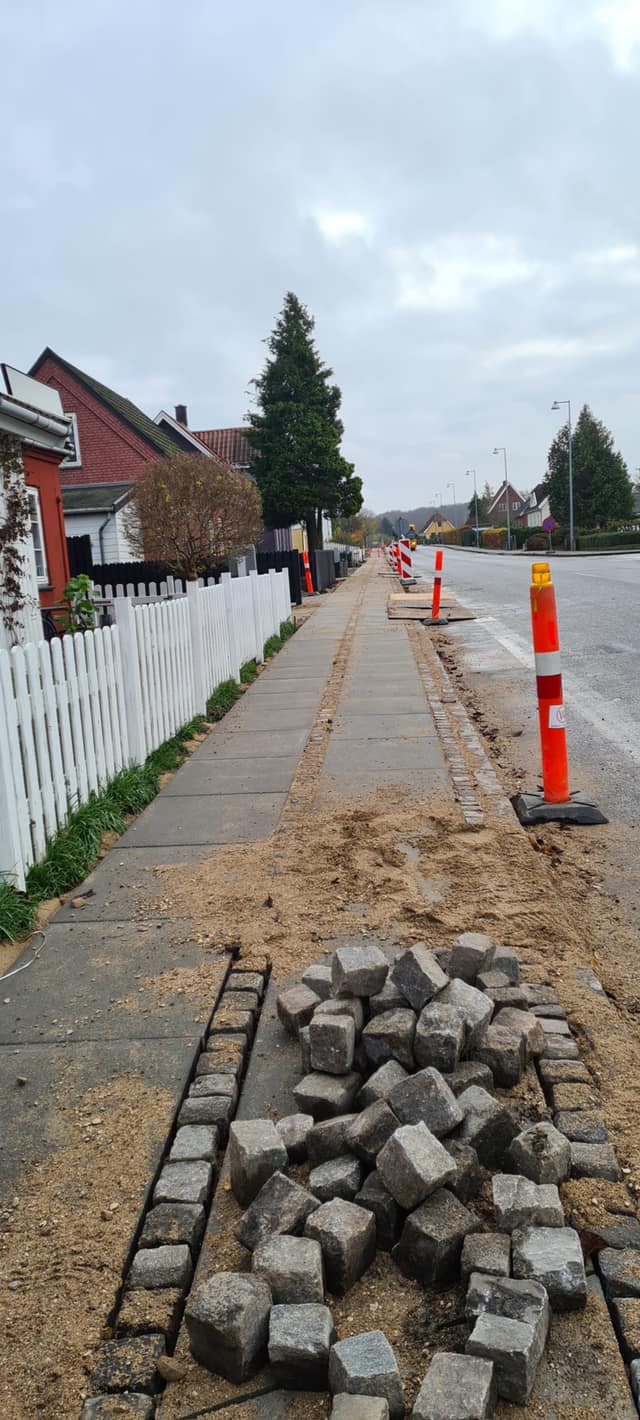 Arbejdet er udført for Faxe Kommune - fortovsrenovering på Moltkesvej i Haslev. Vi har gravet de gamle kantsten og det gamle fortov op, og sat helt nye kantsten samt lagt nye fortovsfliser 80x62,5x7cm, ved indkørsler/overkørsler er der lagt 82x62,5x10cm. Der er lagt en 2 rækker fliser og sat chausséstensbort mellem fortovsfliserne og mellem kantsten og fortovsfliser. Vi slutter af med kantfyldning ude på vejen, op mod kantstenen.