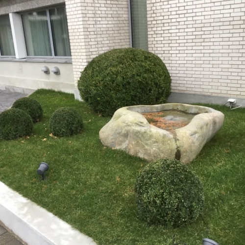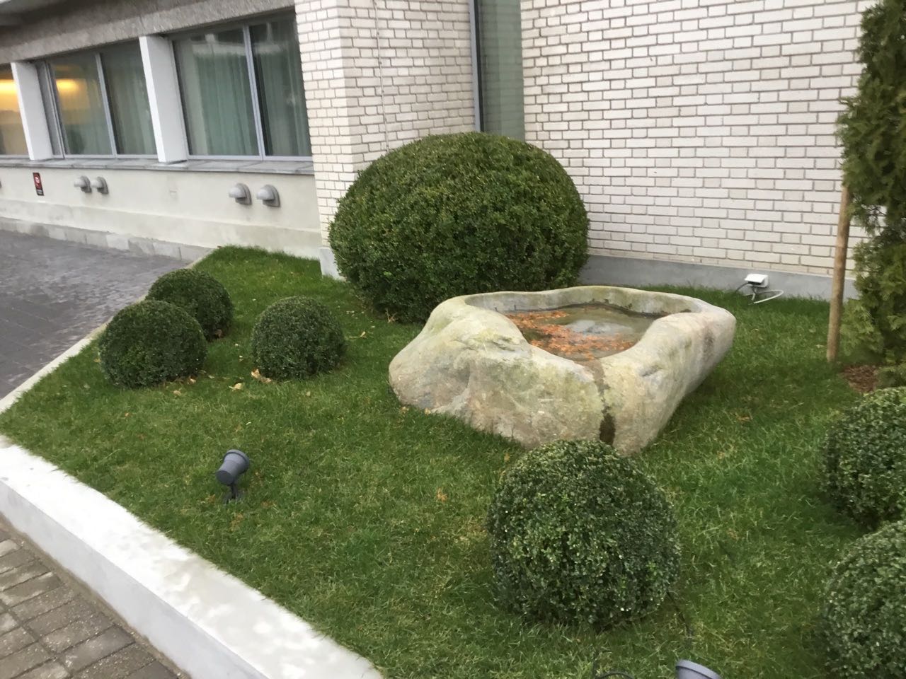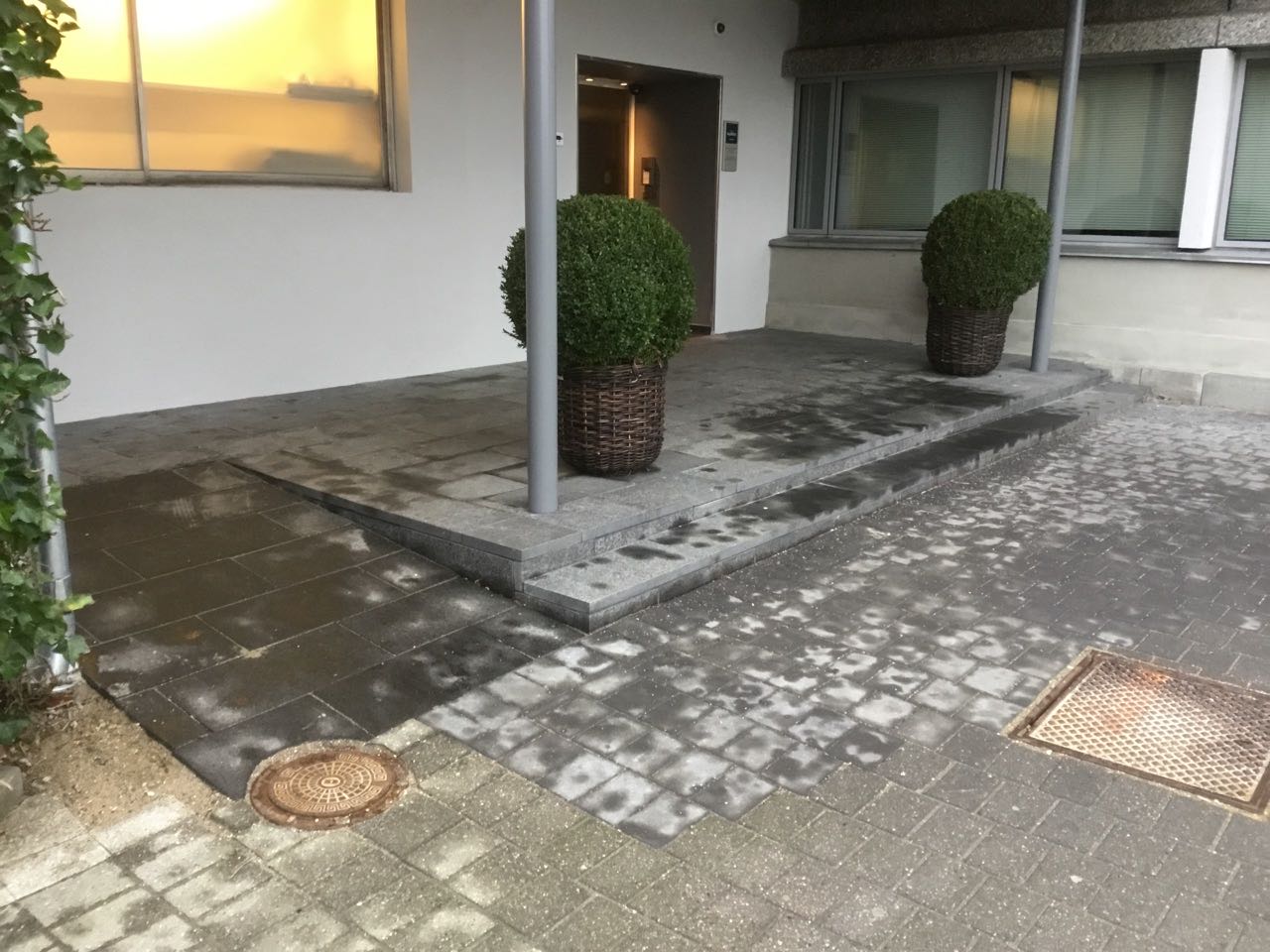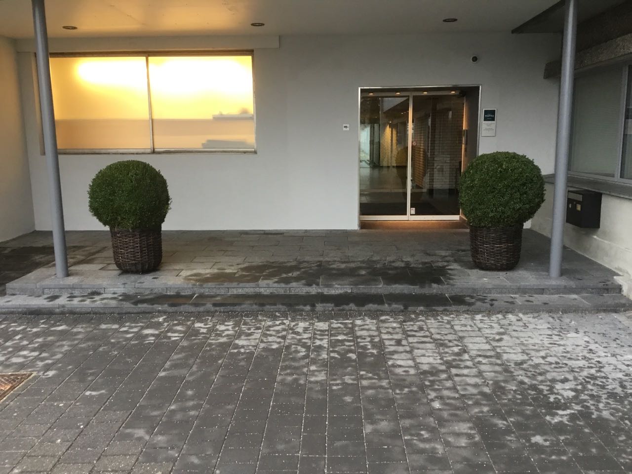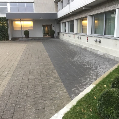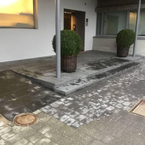 Arbejdet er udført for Hotel Marina. Renovering af forplads og indgangsparti, med nye plantebede sat i støbte fundablokke der er pudset op, herefter er bedene plantet til med græs og buskbom. Indgangspartier er lavet med trappe og rampe i Indisk sort granitflise 30x60cm.