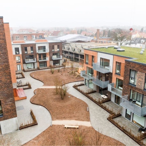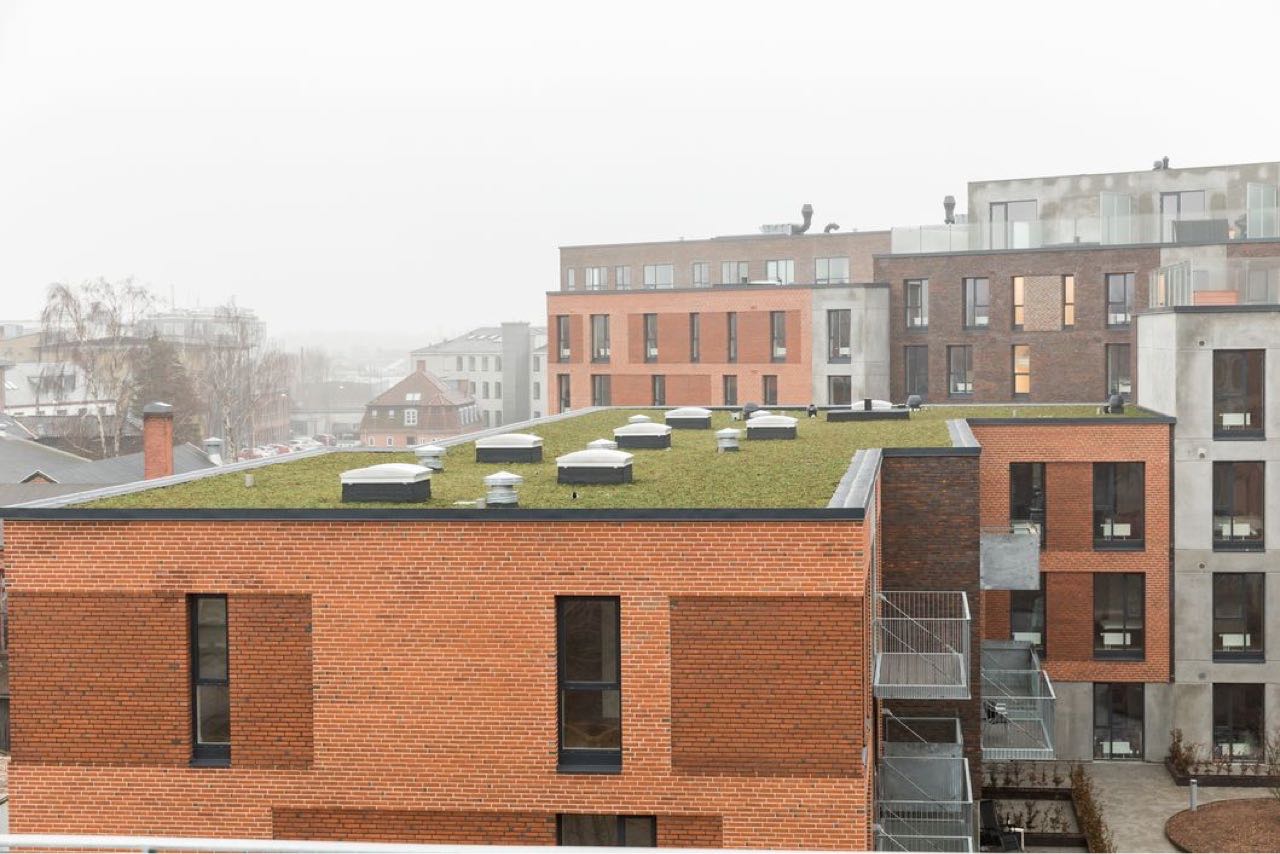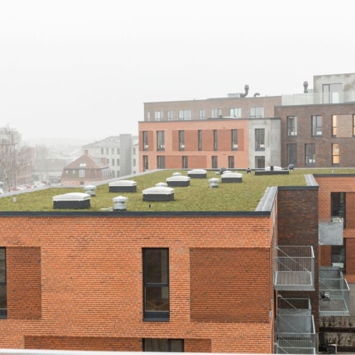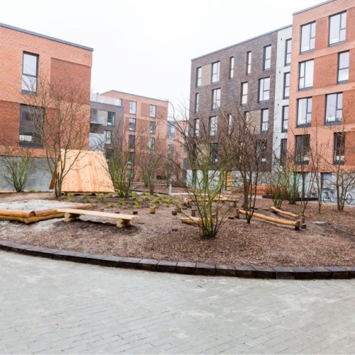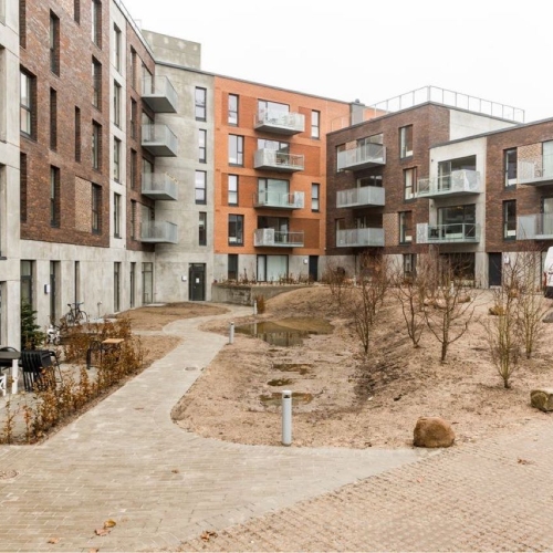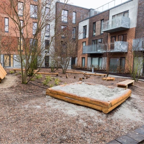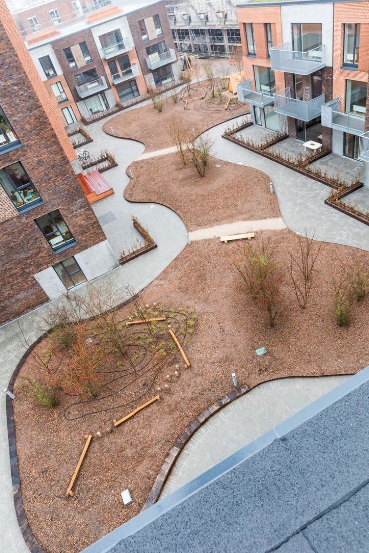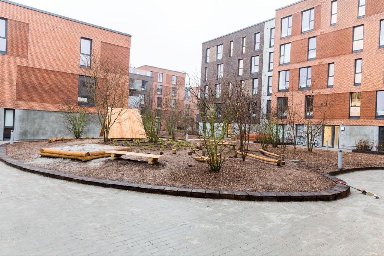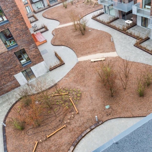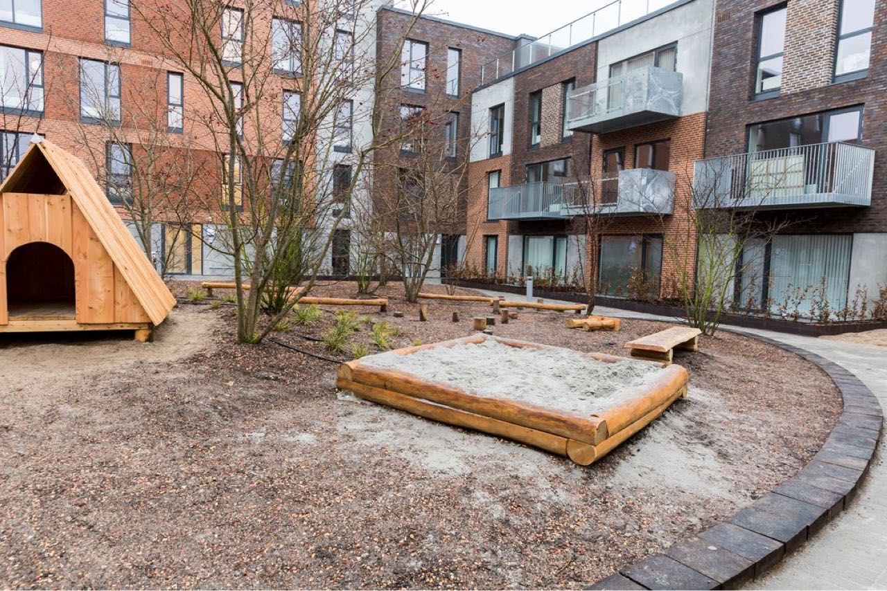 De store regnvandsbede og legeområder er indrammet med jernkanter, og der er opsat diverse legeredskaber. På tagterasserne er der lagt 50x50 fliser, som er sat på fødder.