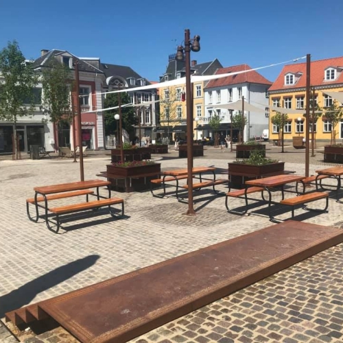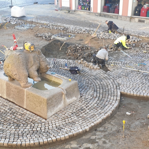 Hele projektet er udført i specielfremstillede jetbrændte svenske chaussésten ca. 5000 kvm eller 470.000 stk chaussésten. Den store åbne plads er sat i lige skifter i grus, vandrender og belægning omkring Bjørnebrønden er sat i beton. Hele belægningen er fuget med ovntørret kvartsand og forseglet med ResiBlok22.