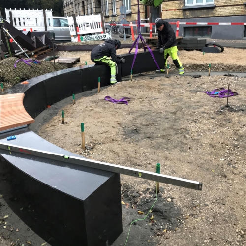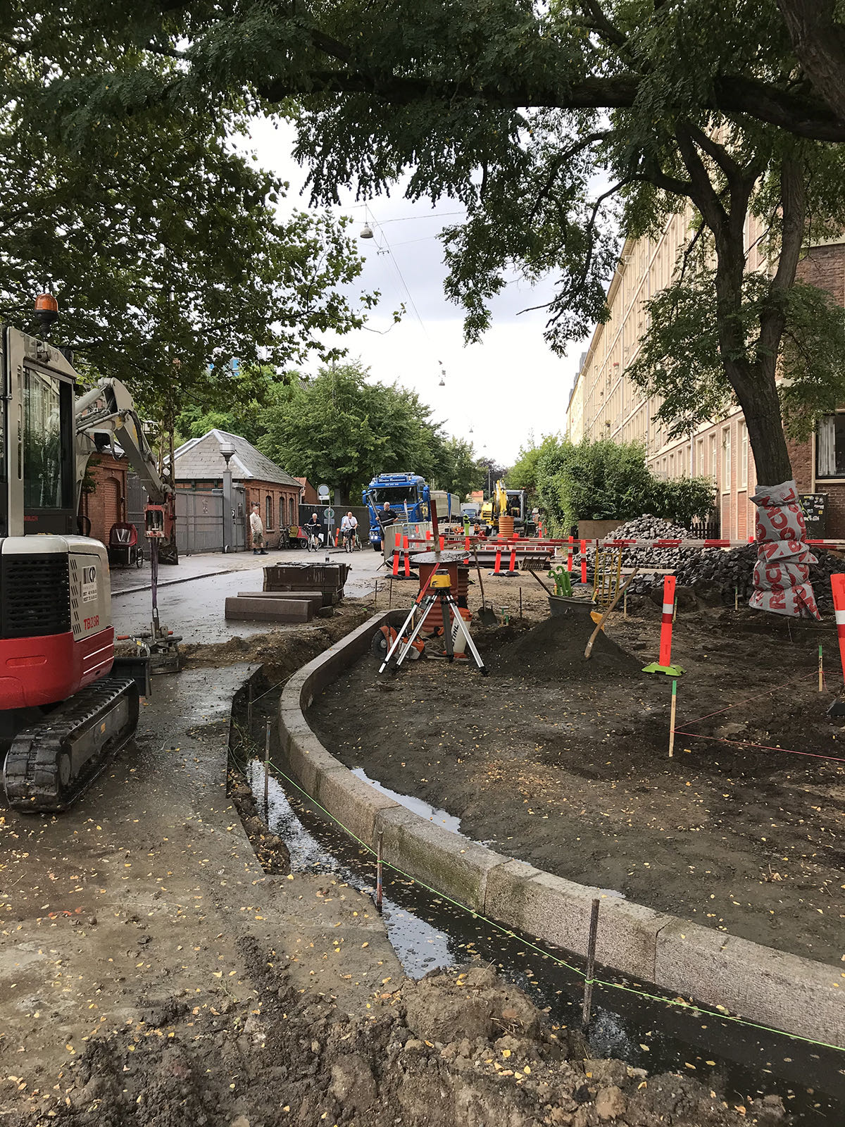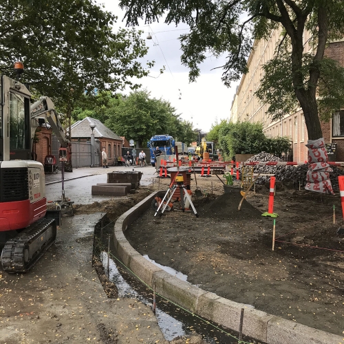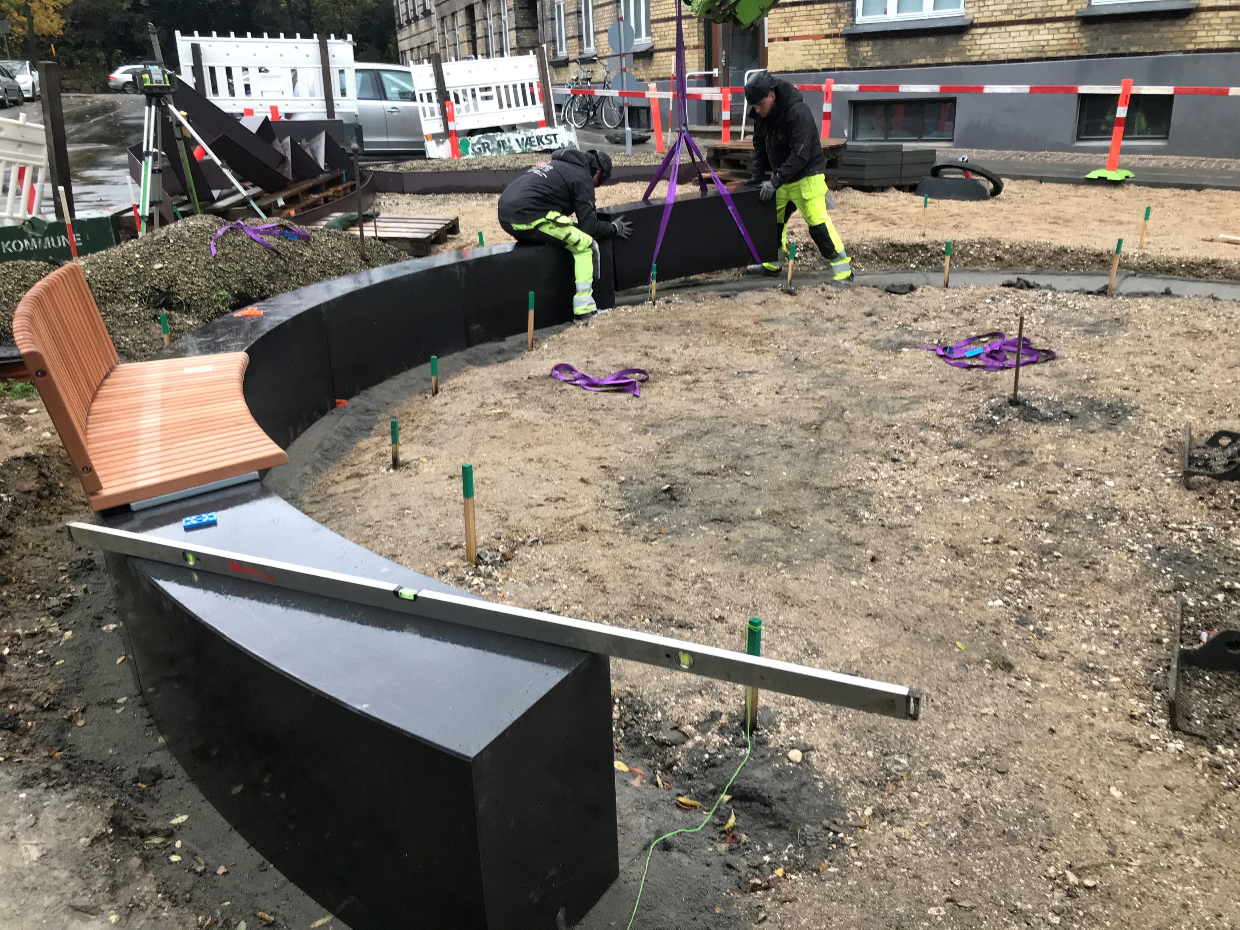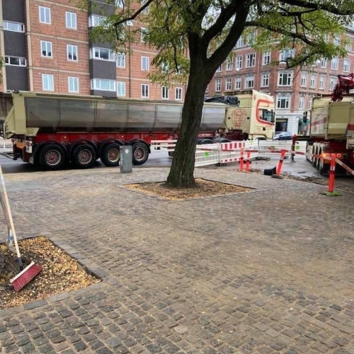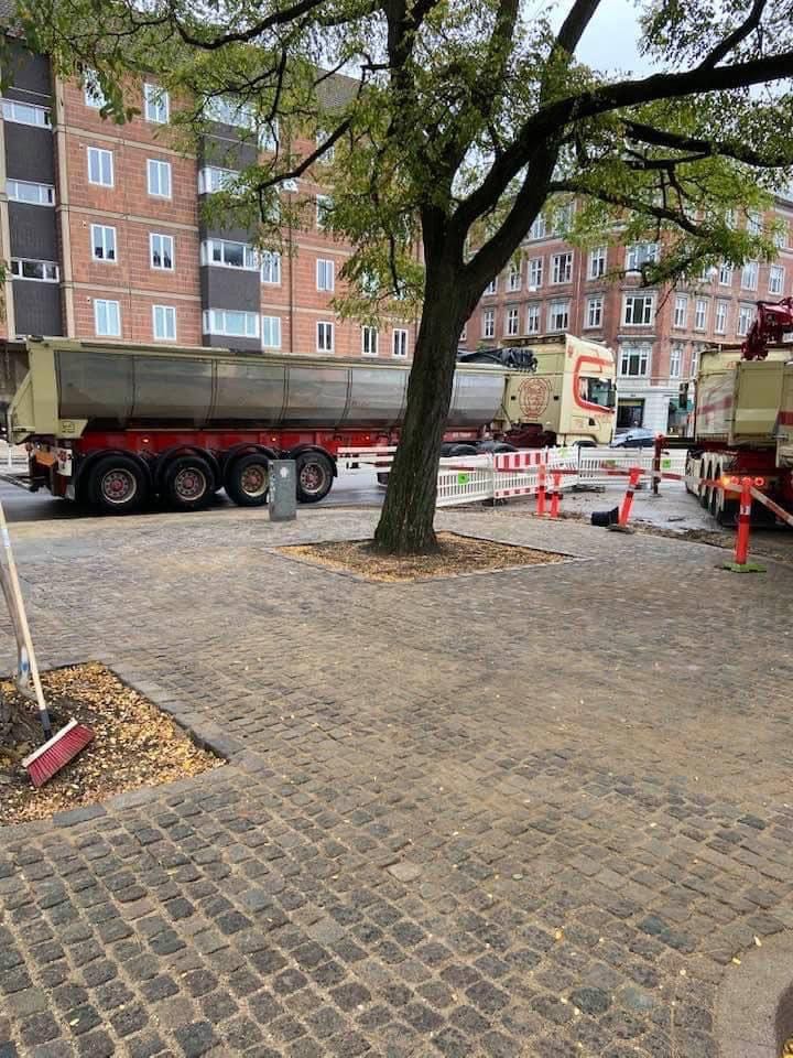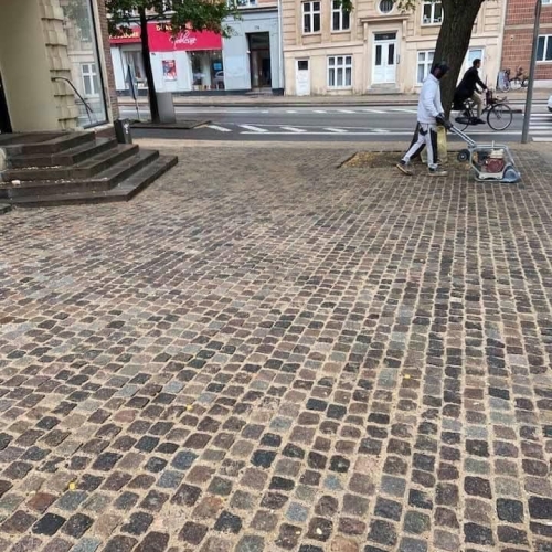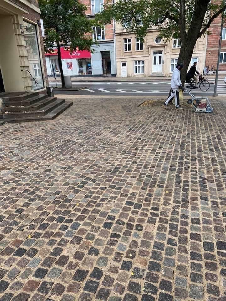 Arbejdet er udført for Hans Frisesdahl A/S. Der er lavet fortovsrenovering hvor vi har sat faskantsten, og lavet fortove i 80x62,5cm NOxOFF fliser. NOxOFF fliser produceres som 2-Lagsbeton og tilføres titandioxid i produktionsprocessen. Når solens stråler rammer den behandlede flise aktiveres det virksomme stof i NOxOFF overfladen. Behandlingen indfanger, indkapsler og nedbryder kvælstofoxiden i luften ved hjælp af sollys. De nedbrudte partikler skylles herefter væk fra fliserne med regnvandet.