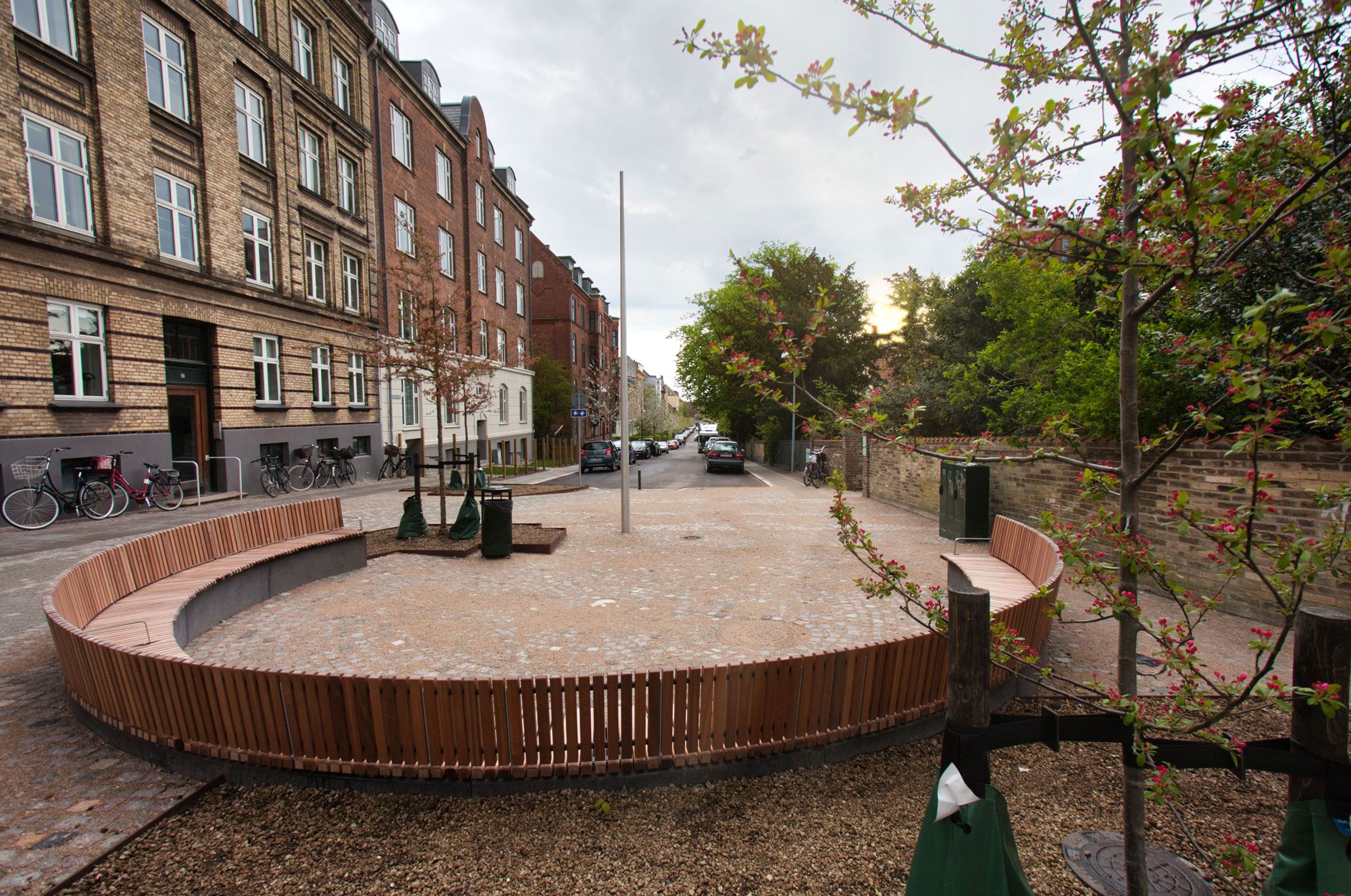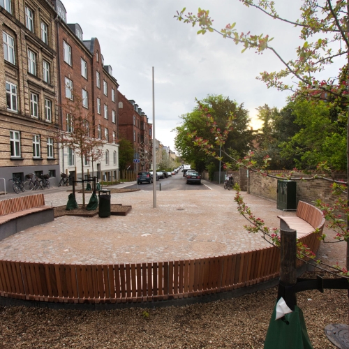 Der er sat brosten i beton i lige skifter som markerer P-pladser. I begge ender af Rahbecks Allé er der åbne pladser. I den ene ende er der sat chaussésten i grus i lige skifter. I den anden ende er der lavet mønsterbrolægning, der består af chaussésten sat i grus i en cirkel, hvor der snor sig en cykelsti igennem, samt sat en rund siddeplint af beton.