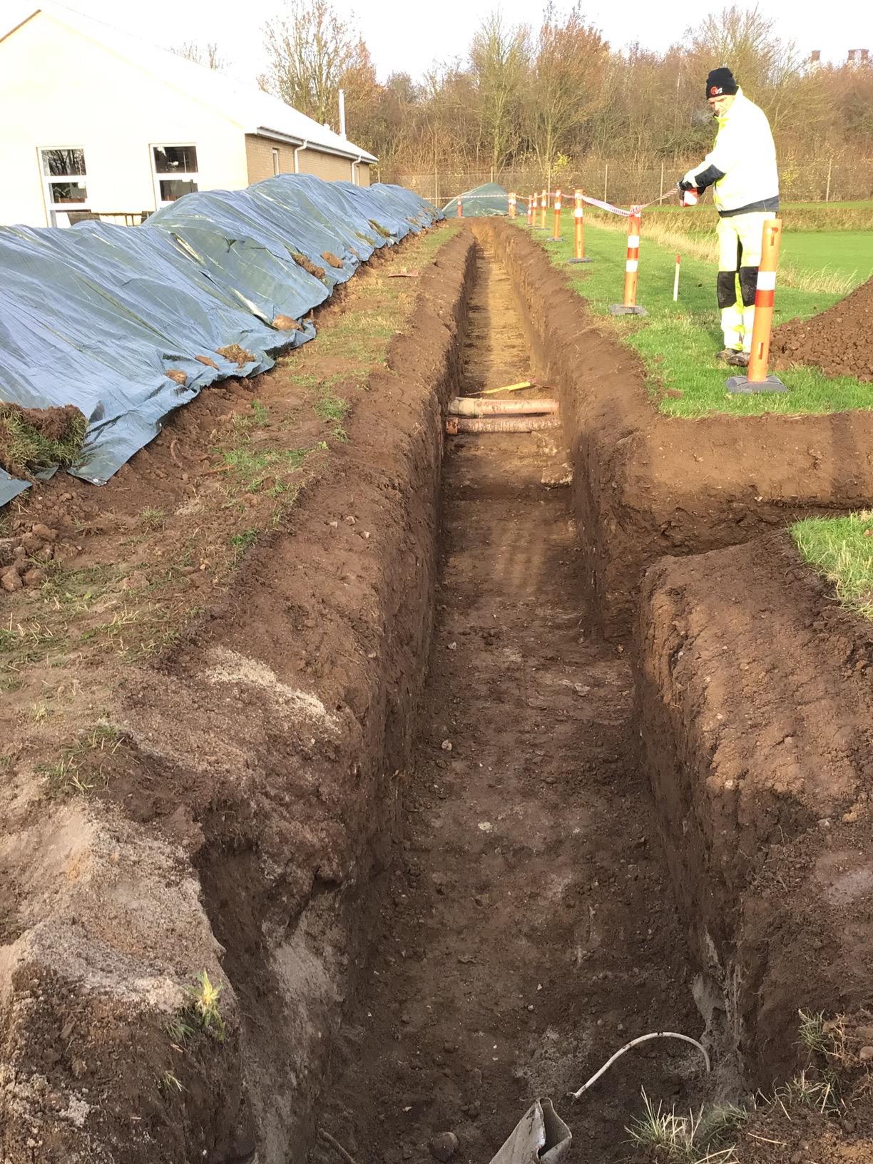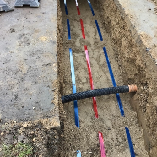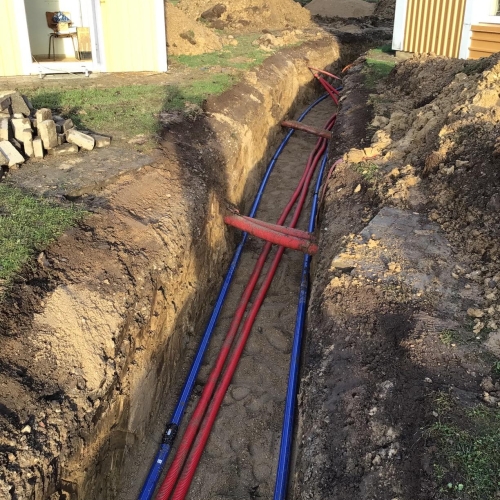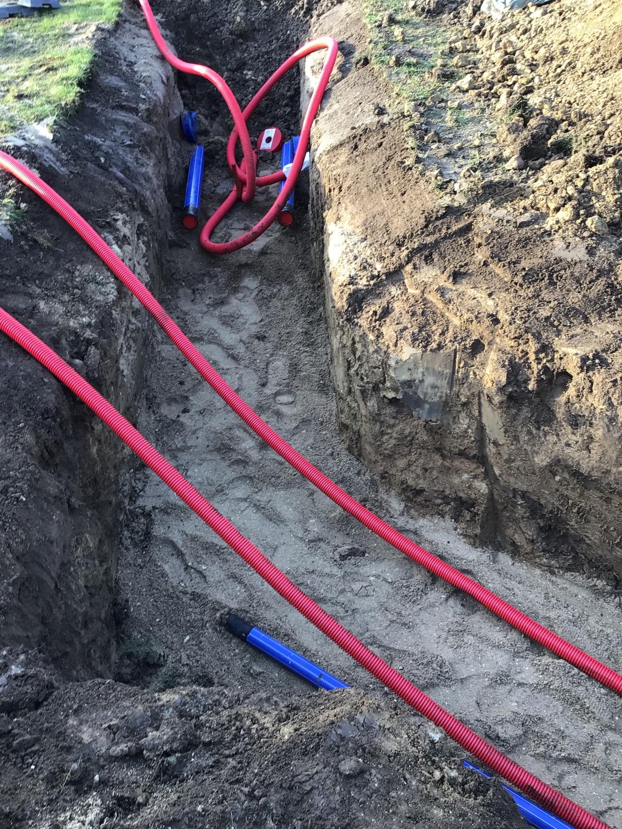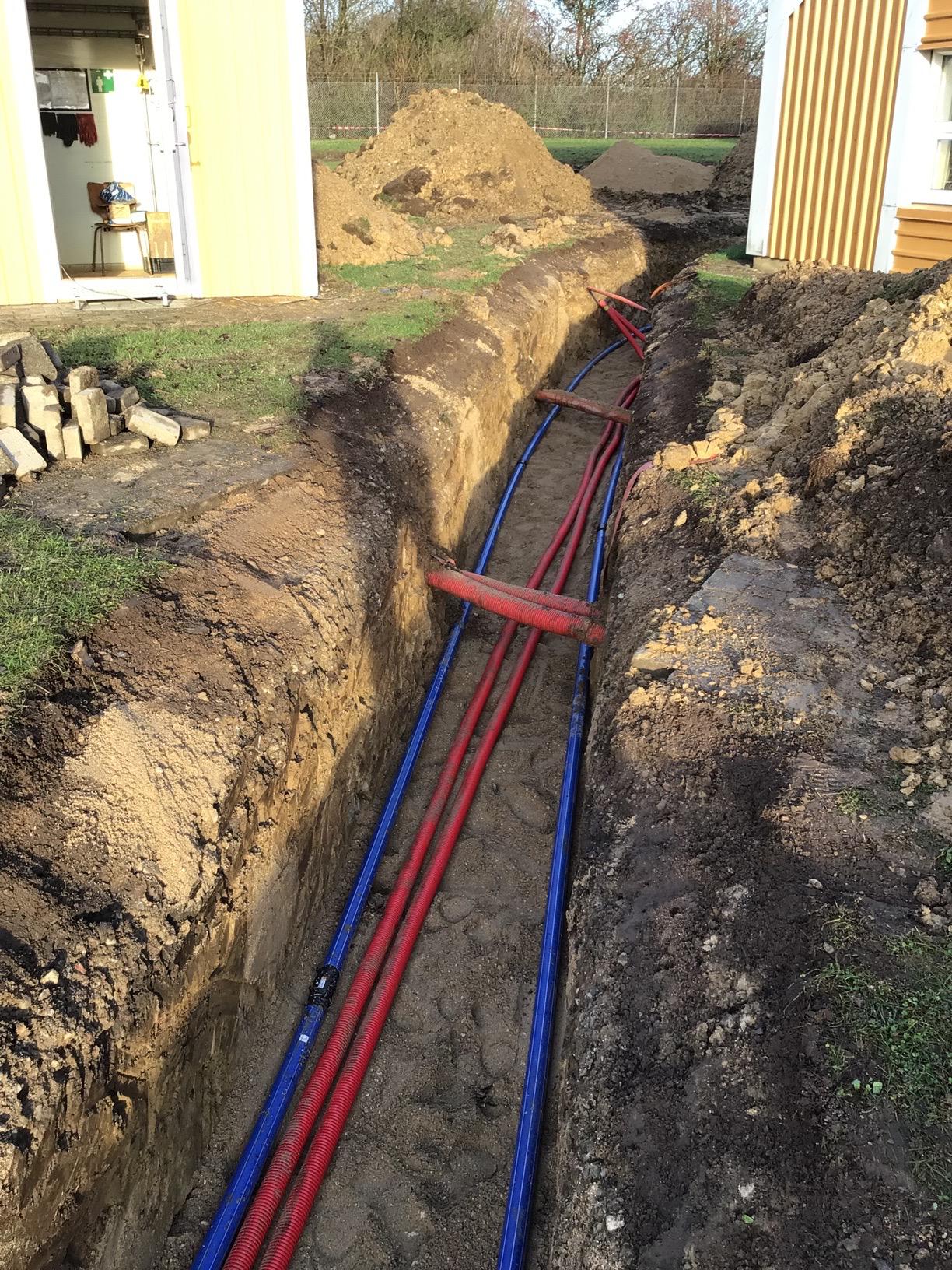 Arbejdet er udført for Ringsted Forsyning. Der er gravet varmevekselrør og elkabler ned. Vi har monteret kabelbrønde, til dem der der trukket føringsrør og lavet opføring til kabelbrøndene.