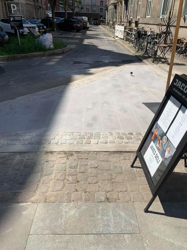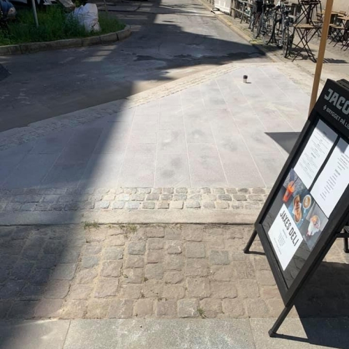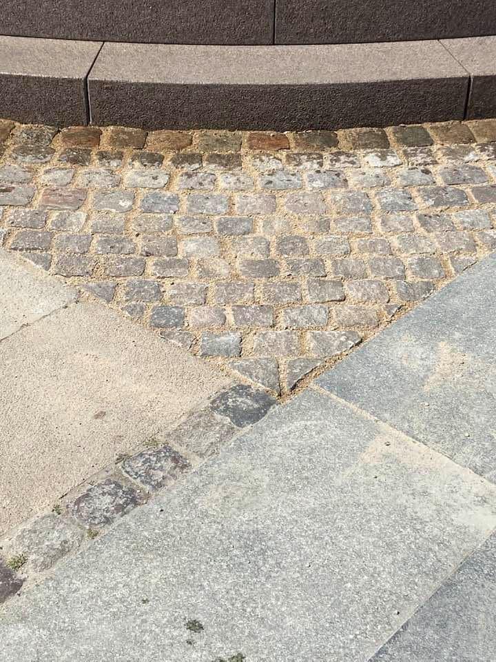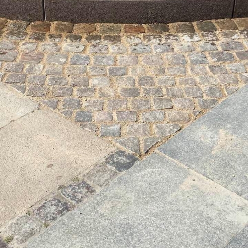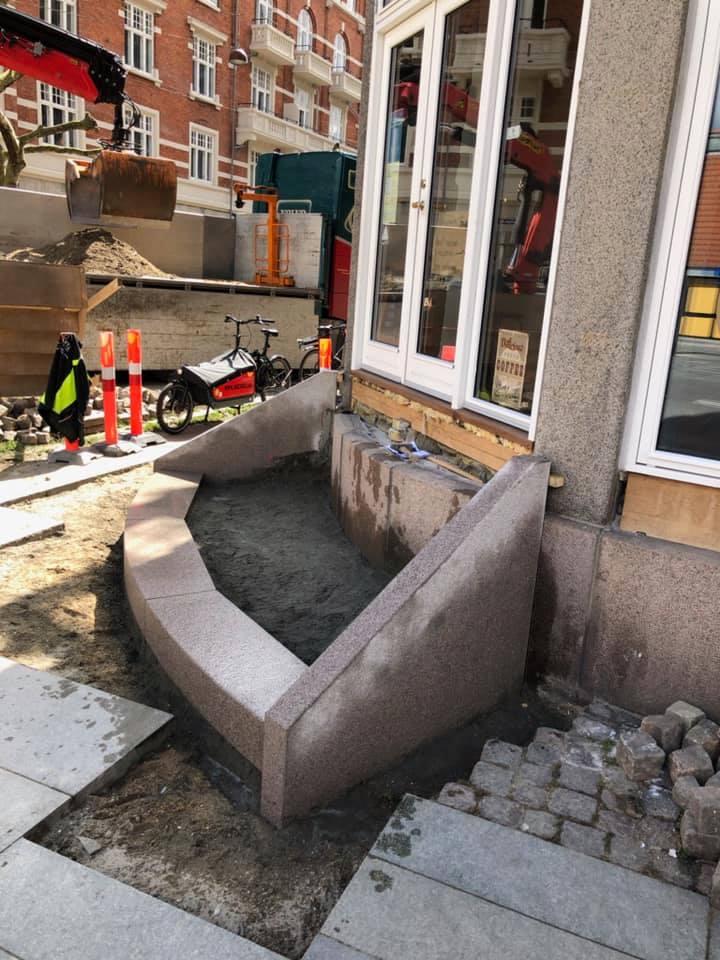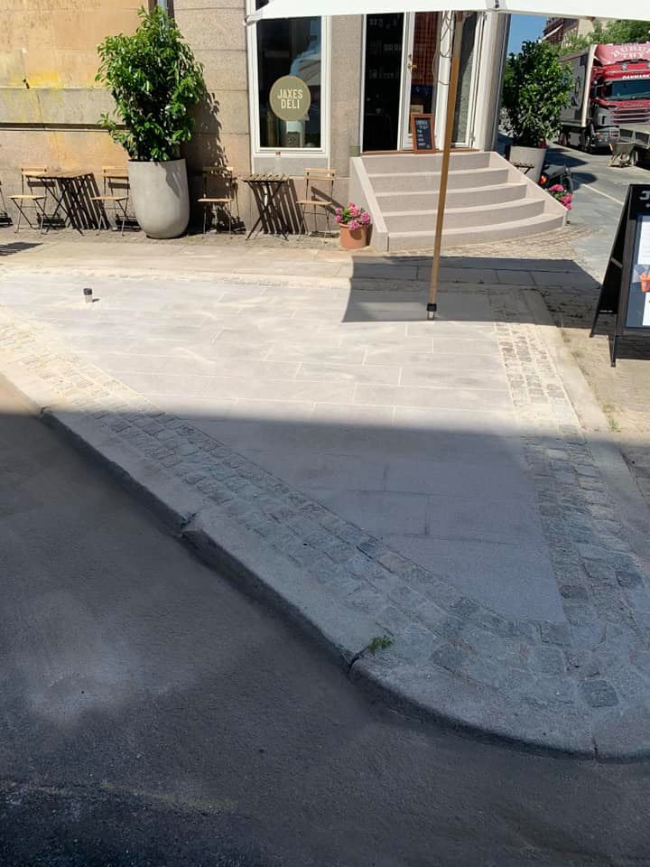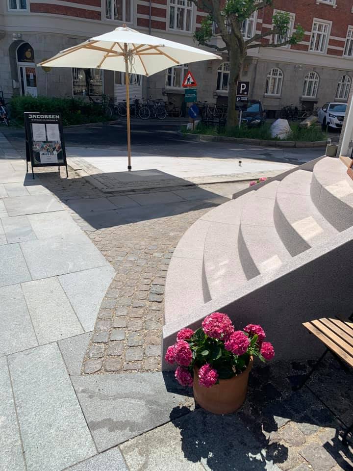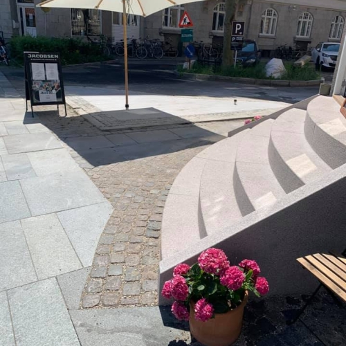 Opgaven er udført i specialfremstillede granit elementer der blev kranet på plads. Resten af indgangspartiet er udført i chaussésten, med tilpasning til fortovsfliserne.