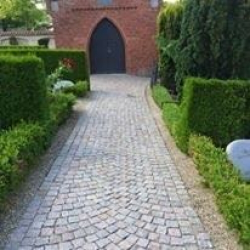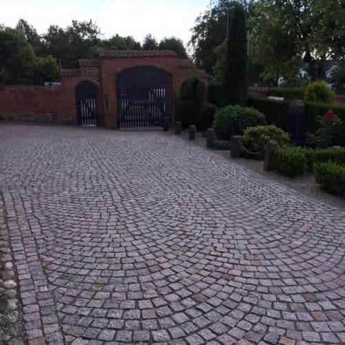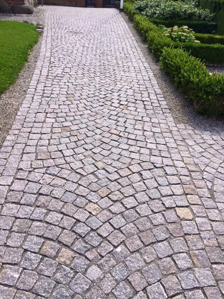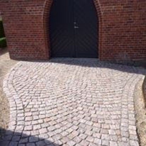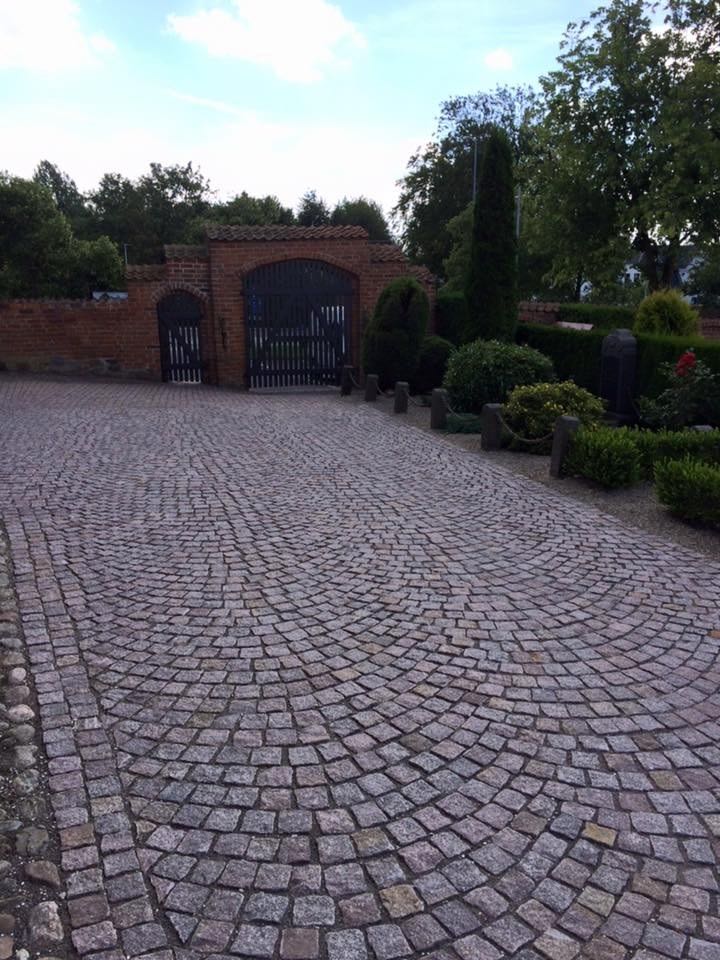 Arbejdet består i sætning chaussésten i buer, dette på hele forpladsen, samt på alle stier.