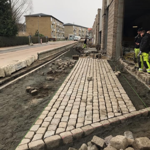 Arbejdet er udført for HME A/S. Arbejdet har bestået af udgravning og bortskaffelse af jord, i forbindelse med udvidelse af vejkassen, da der er etableret cykelsti og nyt højresving. Eksisterende brostenskant er udskiftet med kantsten langs cykelsti og fortov, og der er lagt helt nyt fortov med 80x62,5 fliser og sat chausséstensbort mellem fliser og ud til kantsten. Der er udført brostensoverkørsler ind til ny bebyggelse, gl. slidte brosten NL'ere, sat i beton.