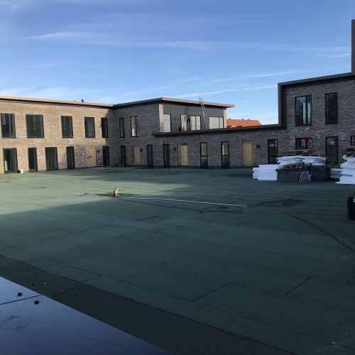 Arbejdet er udført for HME A/S. Der er på tagpappet lagt en membran inden der er udlagt granitskærver og udrullet fiberdug, hvorefter der er etableret 50x50 flisebelægning lagt i grus. Der er lagt taghavemuld op og etabeleret rullegræs, og i jernkummerne har vi plantet 5 forskellige græsarter og lauerbær kirsebær. Foran indgangene er der sat chaussésten i lige skifter.