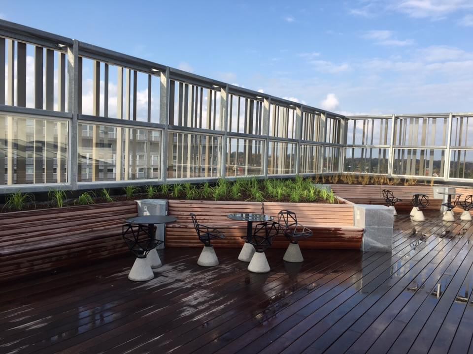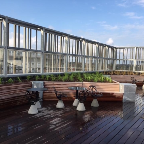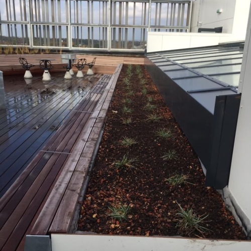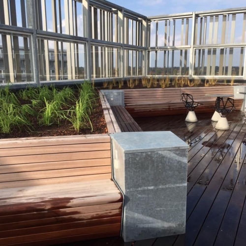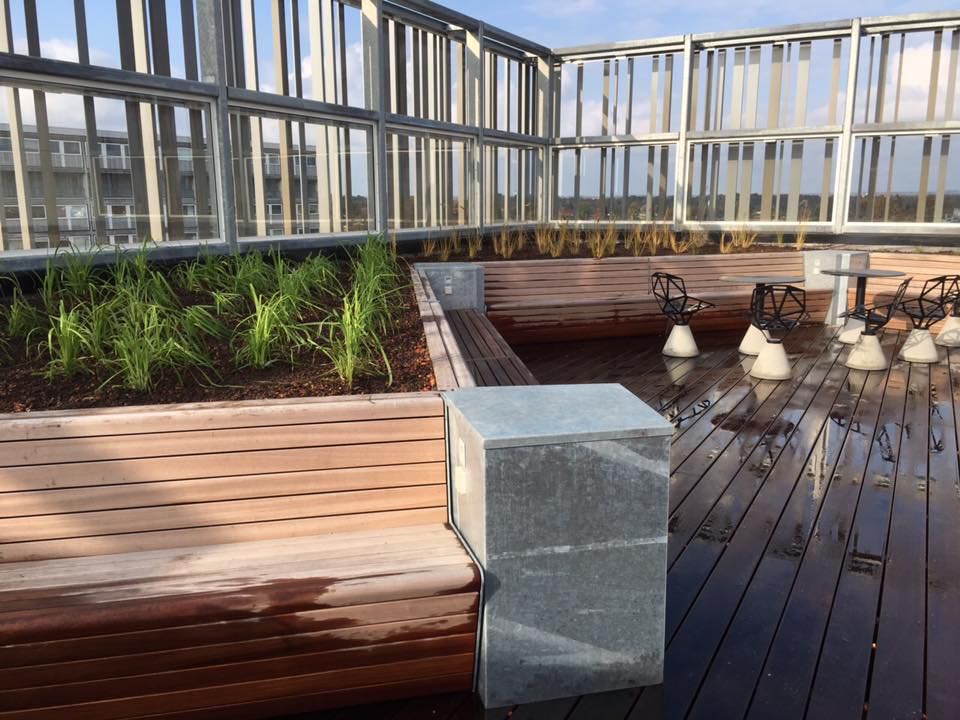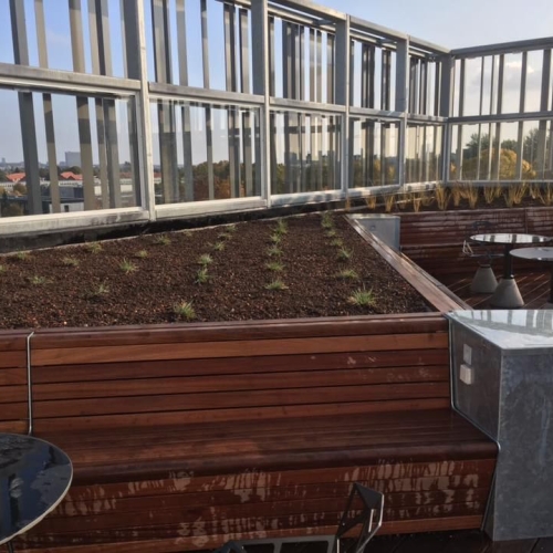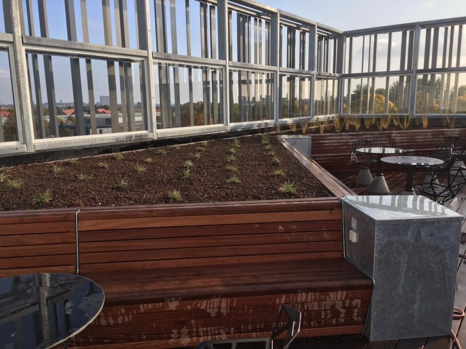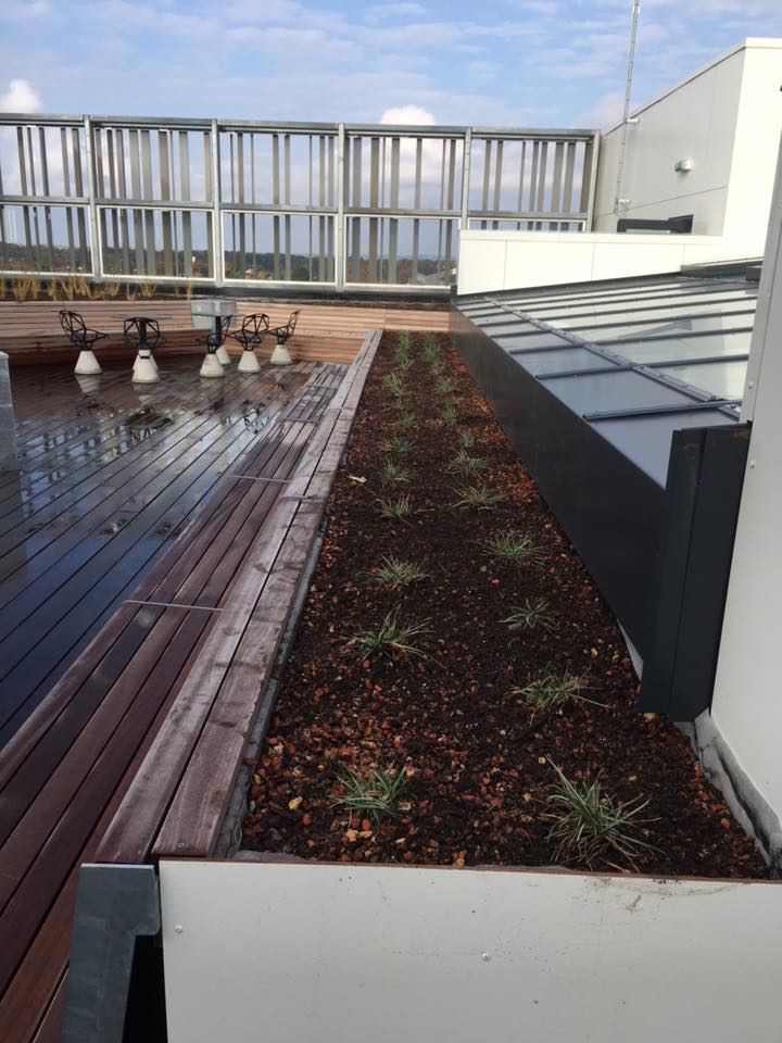Der er på projektet sat opsat drypbakker i alle træbedene, og rullet fiberdug ud over. Der er kranet taghavejord i alle bedene, og efterfølgende er bedene plantet til med forskelllige græsarter.