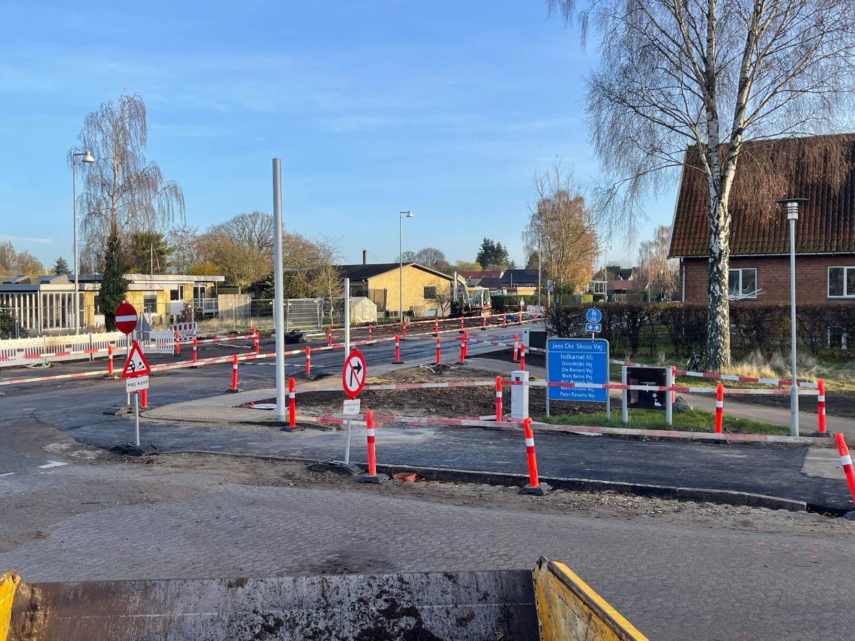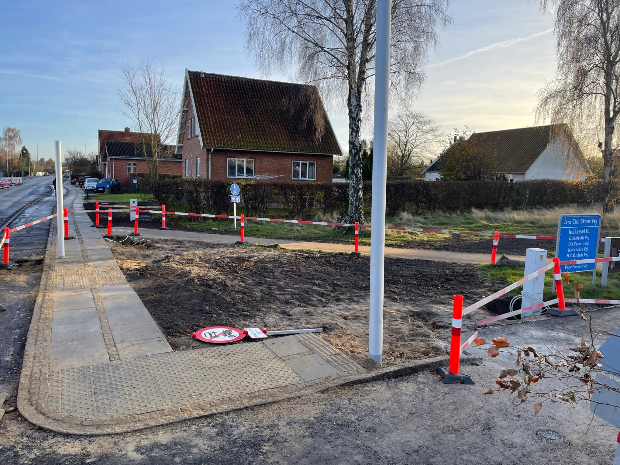 Vi har etableret ny vejkasse, hvor vi herefter har sat nye kantsten, lavet nye fortove og nye cykelstier. Det er udført i fortovsfliser 80x62,5 og chaussésten i Nordisk Mix, og overkørsler er sat i gl. slidte brosten med bordurstens bånd. Sluttelig har veje og cykelstier fået helt ny asfalt.