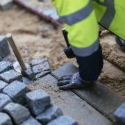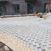 Arbejdet udføres for CG Jensen. Arbejdet består af vej i sildebensmønster, der skal lægges små klostersten i fortov, samt sættes chaussésten i vandrender og brosten i overkørsler.