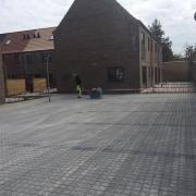 På syd er der lavet en trappe og en rampe op til den store gårdhave, som er bygget op på et drænlag af skærver.