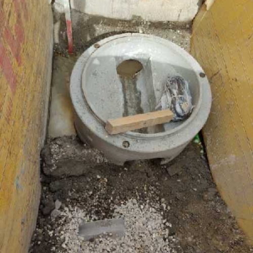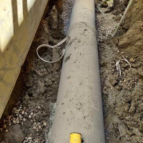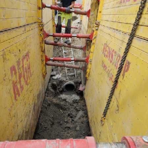 Arbejdet er udført for NRE A/S. Der er udskiftet en Ø250 betonledning til en Ø400 beton ledning - hvor vi har været 4 til 5 meter i jorden. Vi har udgravet og bortskaffet forurenet jord jf. samarbejde med MOE A/S, samt indbygget nye materialer i udgravning.