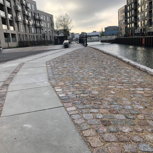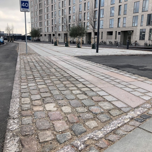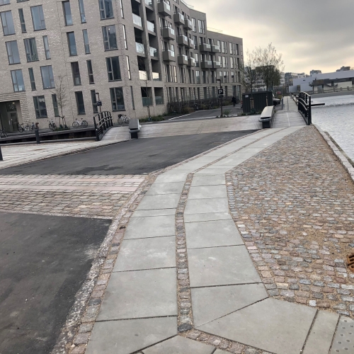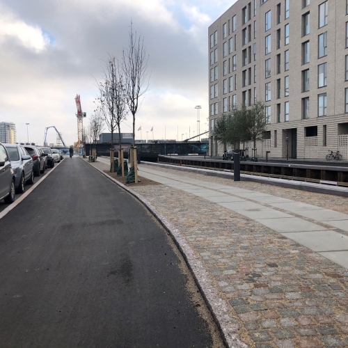 Vi har etableret ny vejkasse, hvor vi herefter har sat nye kantsten, lavet nye fortove og nye cykelstier. Det er udført i fortovsfliser 80x62,5 og chaussésten i Nordisk Mix, og overkørsler er sat i gl. slidte brosten med bordurstens bånd. Sluttelig har veje og cykelstier fået helt ny asfalt.