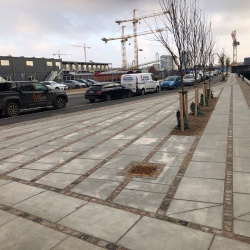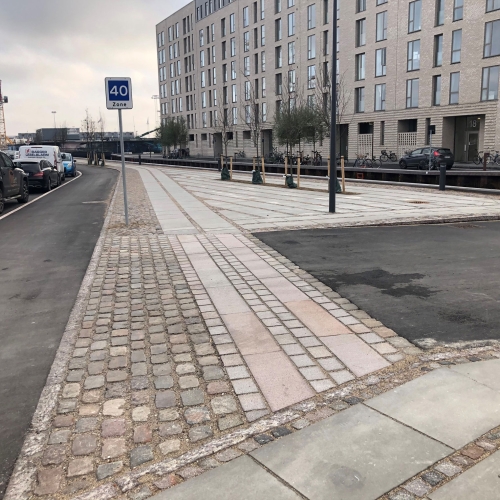 Vi har etableret ny vejkasse, hvor vi herefter har sat nye kantsten, lavet nye fortove og nye cykelstier. Det er udført i fortovsfliser 80x62,5 og chaussésten i Nordisk Mix, og overkørsler er sat i gl. slidte brosten med bordurstens bånd. Sluttelig har veje og cykelstier fået helt ny asfalt.