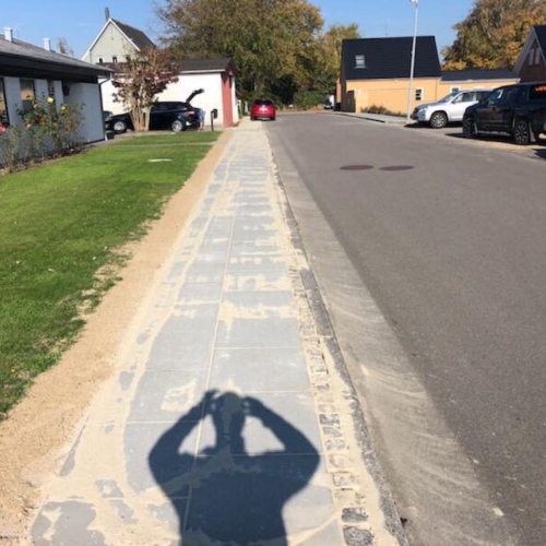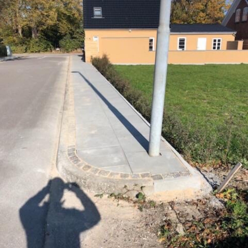 Arbejdet er udført for Lollands Kommune. Der er udført fortovsrenovering, hvor vi har gravet det gamle fortov op og og sat nye kansten, samt lagt nye fortovsfliser i 2 skifte og sat chaussésten i bort ud til kantsten.