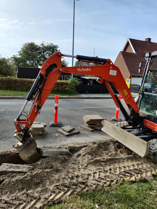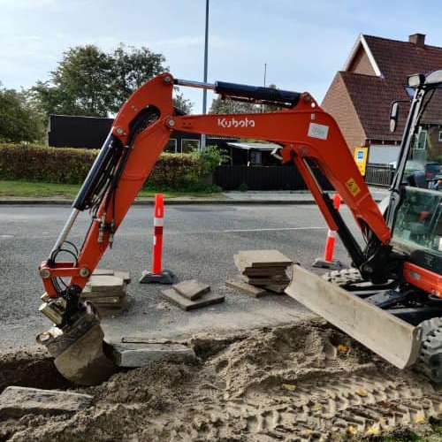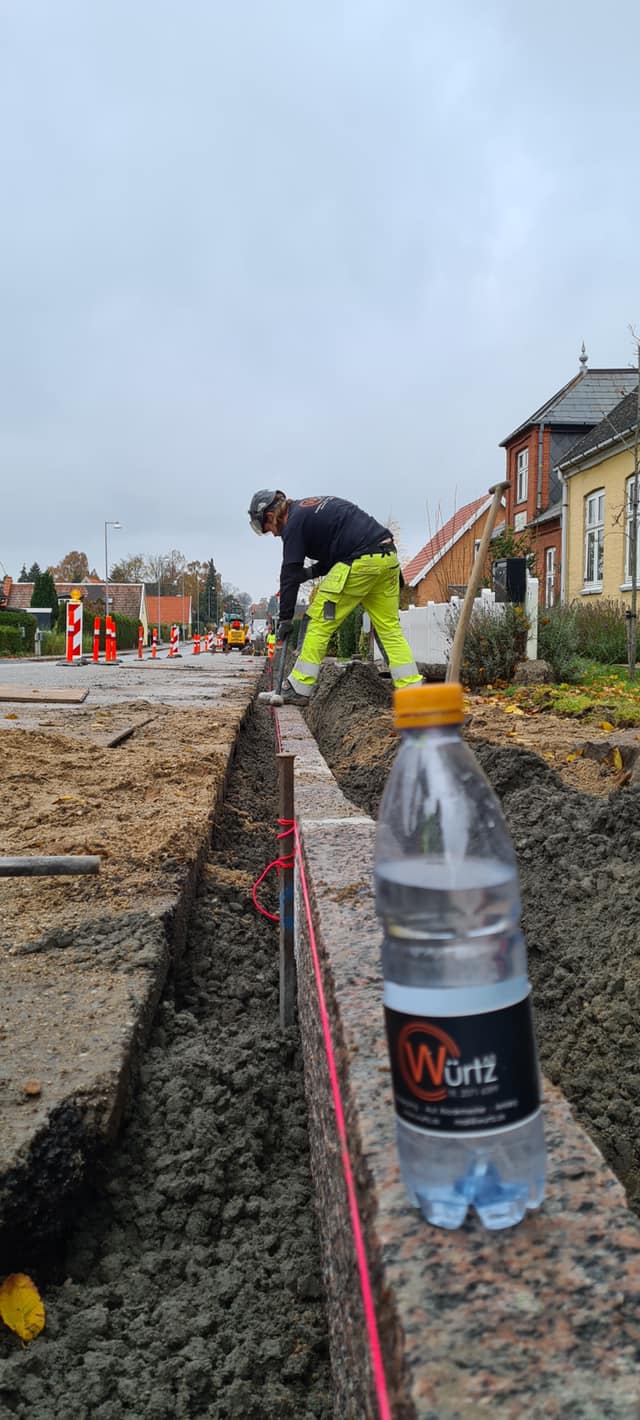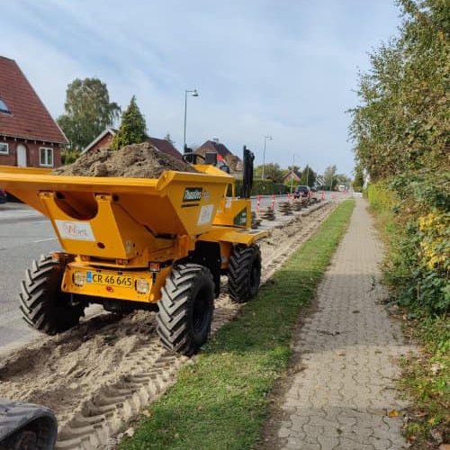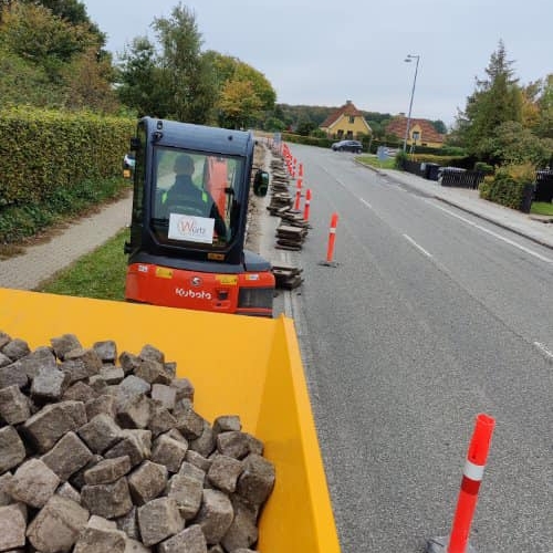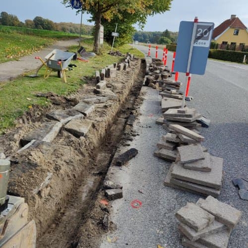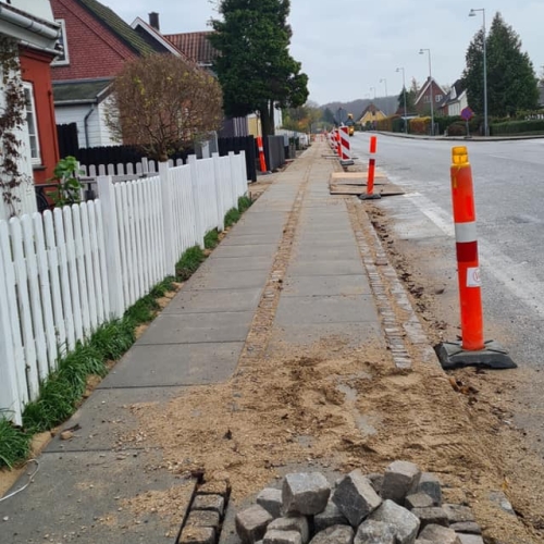 Arbejdet er udført for Faxe Kommune - fortovsrenovering på Moltkesvej i Haslev. Vi har gravet de gamle kantsten og det gamle fortov op, og sat helt nye kantsten samt lagt nye fortovsfliser 80x62,5x7cm, ved indkørsler/overkørsler er der lagt 82x62,5x10cm. Der er lagt en 2 rækker fliser og sat chausséstensbort mellem fortovsfliserne og mellem kantsten og fortovsfliser. Vi slutter af med kantfyldning ude på vejen, op mod kantstenen.