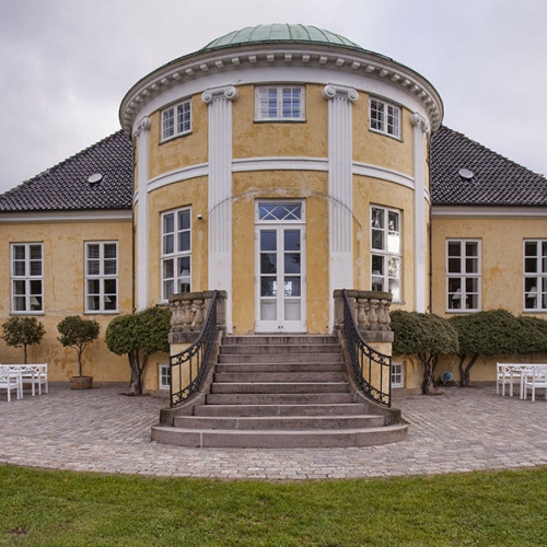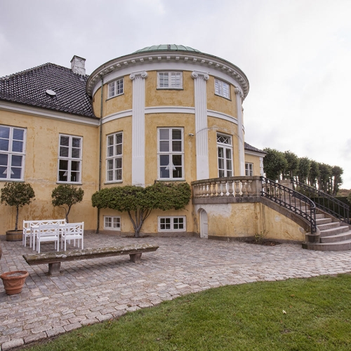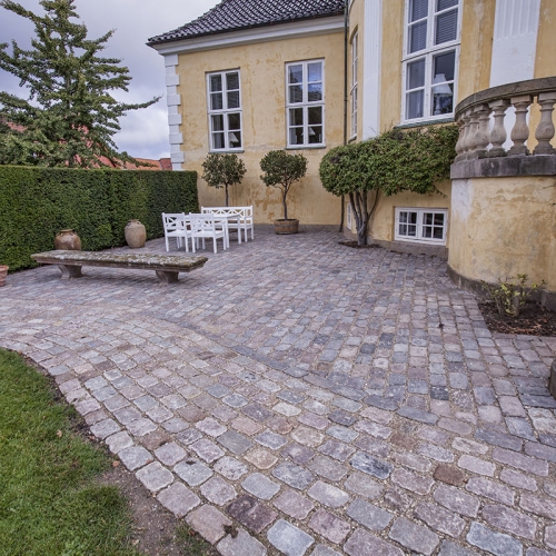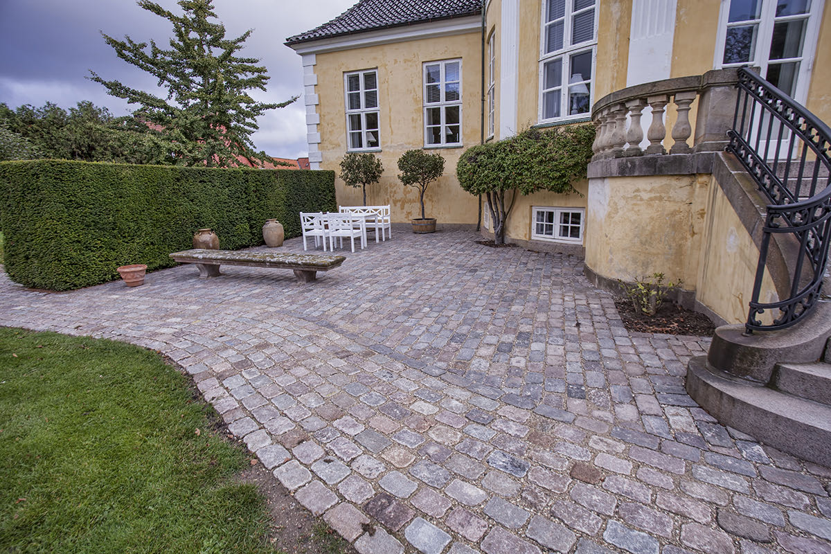 Projektet er udført i gl. slidte brosten NL'ere sat i grus. Til en start skulle stykkerne til højre og venstre for trappen blot omsættes pga tidens tand, men undervejs i projektet valgte Frydenlund Slot, at omsætte stien foran trappen, så området fremstår som nyanlagt.