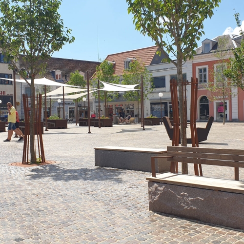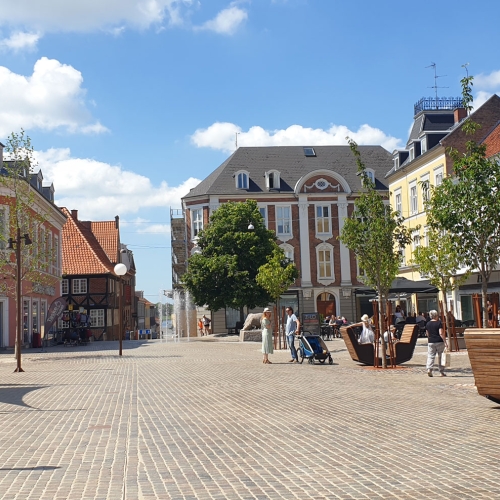 Hele projektet er udført i specielfremstillede jetbrændte svenske chaussésten ca. 5000 kvm eller 470.000 stk chaussésten. Den store åbne plads er sat i lige skifter i grus, vandrender og belægning omkring Bjørnebrønden er sat i beton. Hele belægningen er fuget med ovntørret kvartsand og forseglet med ResiBlok22.